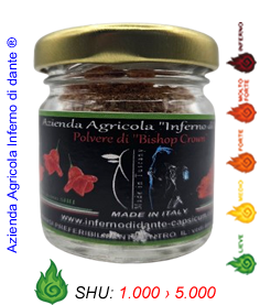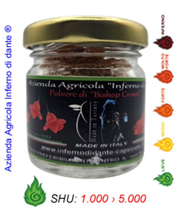 Il Bishop Crown, noto anche come Christmas Bell o Campanaro, è una varietà di Capsicum baccatum molto riconoscibile per la sua forma unica “a campana” o “a cappello vescovile”. In polvere sprigiona un aroma fruttato, leggermente agrumato e fresco, con una piccantezza delicata, piacevole e adatta a molte preparazioni.